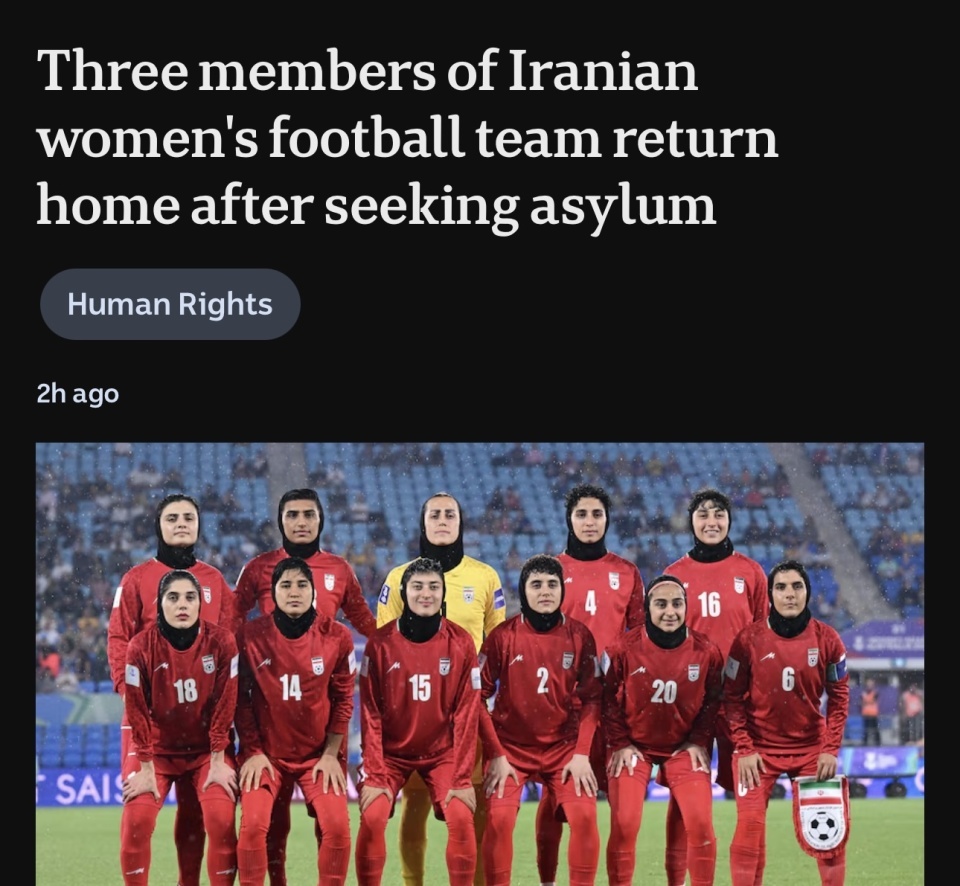 北京时间3月15日,据伊朗媒体报道,伊朗体育报表示3名在澳大利亚寻求庇护的伊朗女足成员决定返回伊朗,这样一来,已有4人反悔。
