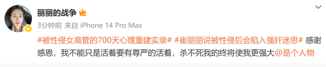崔丽丽发文:我不能只是活着,要有尊严的活着,杀不死我的终将使我更强大。