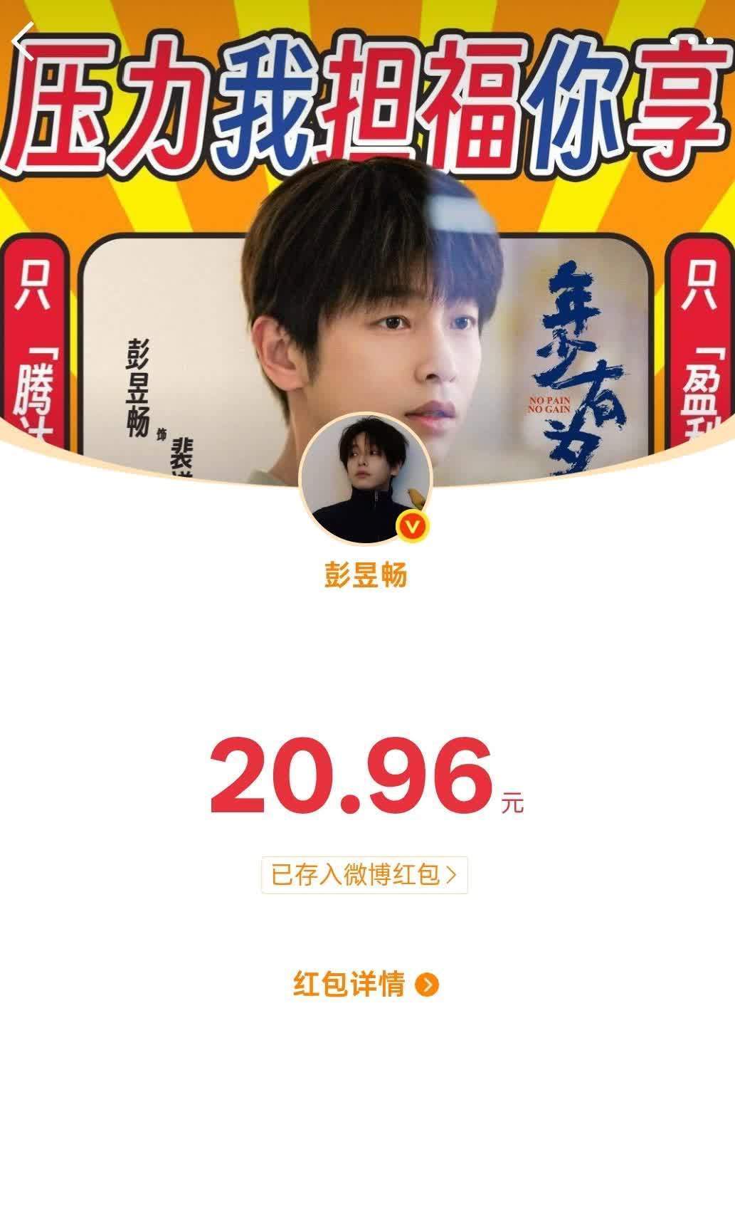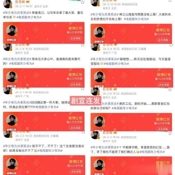 这部剧主演彭昱畅的宣传非常用心,从开播首日发一万的红包,之后每天都发口令红包,一连发了15天,总计15万左右。每天的红包口令都是剧中的剧情,只有认真看剧的人才能拿到红包。